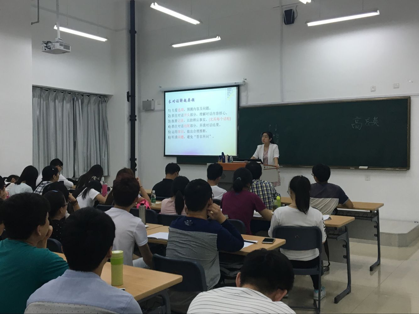 高老师结合经典题型与自己的评卷经验,给大家传授了优秀作文的结构脉络与精巧细节。并举两篇例文将高分作文和低分作文做对比,使同学们深刻领悟四六级写作的精髓。在听力方面,高老师分述了各题型的考查内容与解题要领,并针对今年的听力改革做了详细介绍,让大家不必过多担心新题所带来的影响。阅读作为大家熟悉的部分,高老师着重给大家讲述了时间分配问题,使同学们能够在有限的时间达到最好的解题效果。对于翻译,高老师利用样卷给同学们分析了主要考查点,逐个击破。