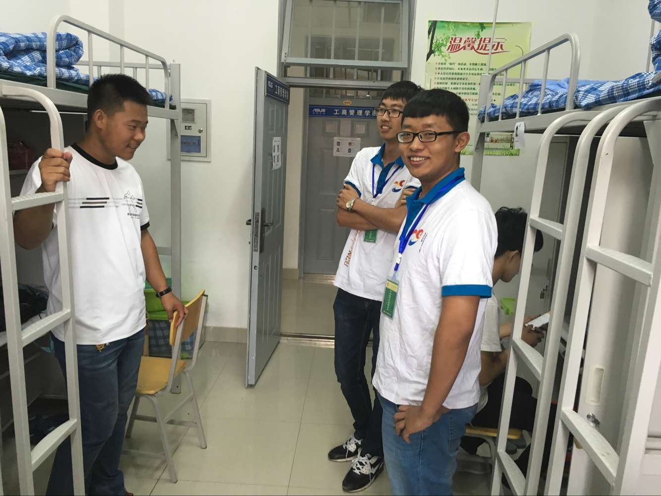 你以为大一新生报到后来到寝室第一眼见到的是谁?室友吗?不是!是新葡的京集团35222vip2016级学生成长发展指导员。这种出场方式,令人想起王菲的经典歌曲:只是因为在开学时多看了你一眼,再也没能忘掉你容颜。2016年9月10日正值第32届教师节,新葡的京集团35222vip2016级新生在的浑南校区迎来了报到日。为使大一新生更快适应大学生活,熟悉浑南校区的校园环境,由新葡的京集团35222vip2016级学生成长发展指导员组成的“商英导航团”身穿文化衫,佩戴工作牌,8点30分准时到各自负责寝室等候,迎接新生的到来。