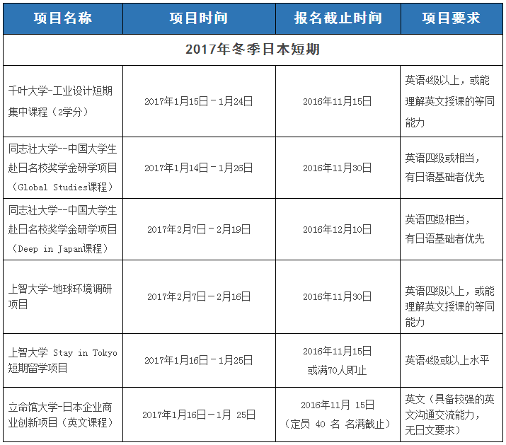 3、报名截止日期:见《2017年寒假日本短期交流项目一览》(至少提前一周上交报名材料)