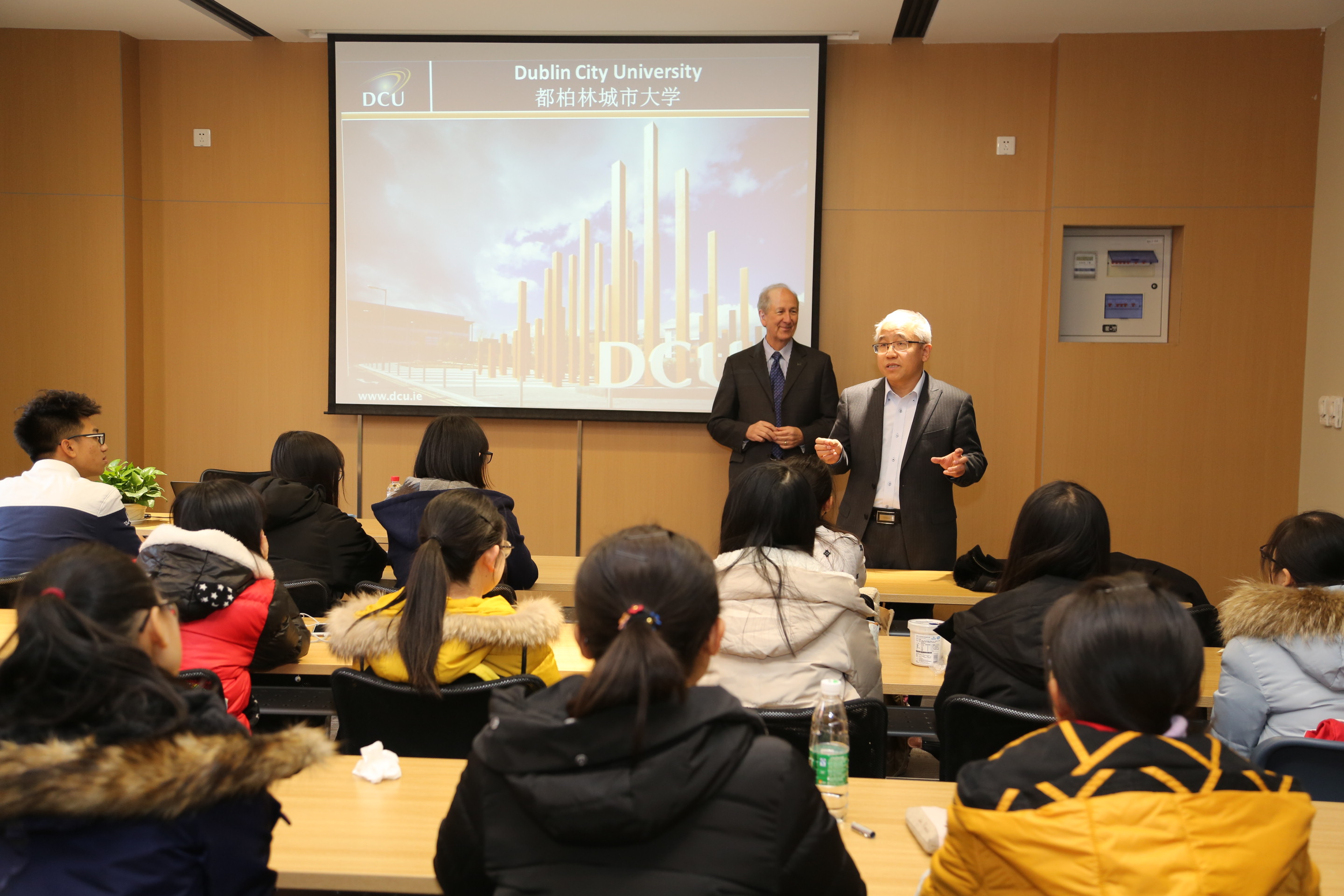 随后, Bernard Pierce和Yuhui Gao 系统地为新葡的京集团35222vip学生解读了《新葡的京集团35222vip与爱尔兰都柏林城市大学商学院3+1+1联合教学项目》,从地理位置、经济发展、文化传统等方面介绍爱尔兰的风土人情和都柏林城市大学的校园环境及氛围、学校资源及设施等,并着重介绍了都柏林城市大学商学院的特色,解答了学生们的提问。