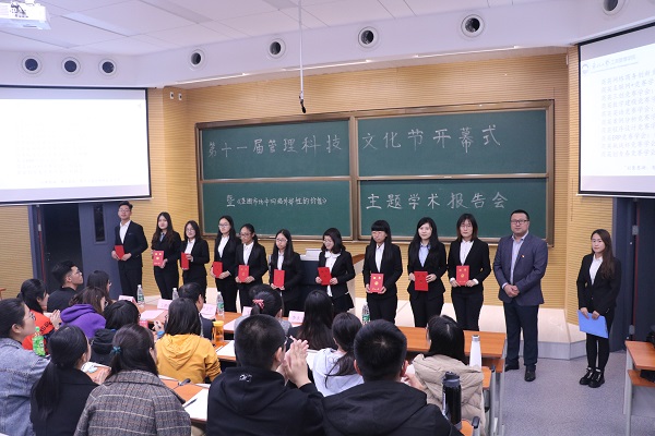 活动回顾了管理学院往届科技活动及全国赛事的精彩瞬间,介绍了此届科技文化节的比赛项目。王刚上台致辞,肯定了管理科技文化节为学生综合素质提升所做出的贡献,鼓励同学们参加多层面的科技创新竞赛活动,强化实践能力与创新能力。严立宁为新成立的各商英竞赛学会会长颁发聘书,各位会长上台受聘。商英网络商务创新竞赛学会会长刘祥宁代表发言,分享了自己往年的参赛经历及体验。此次开幕式设立科普趣味知识竞赛环节,普及科普知识,激发同学们对科技创新竞赛的兴趣。