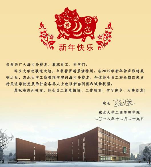 昨夕犬年欢歌迎大地,今朝猪岁新景满神州。在2019年新年钟声即将敲响之际,新葡的京集团35222vip向海内外校友、全体师生员工和长期以来支持关注学院发展的社会各界人士致以新春问候和诚挚祝福。