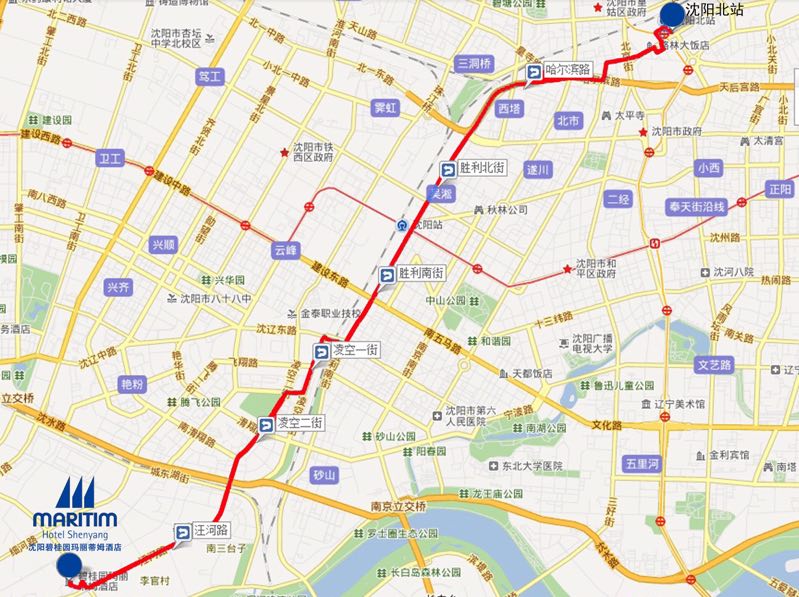 路线3 | 在沈阳北站打车到玛丽蒂姆酒店,全程14公里,约35元。 |