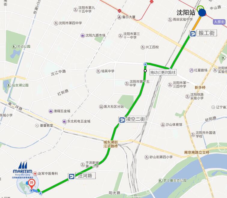沈阳站→玛丽蒂姆酒店 | 路线1 | 在沈阳站乘坐地铁1号线(十三号街方向)到铁西广场下车(2站),在站内换乘坐地铁9号线(建筑大学方向),在大通湖街下车(5站),在B出口出地铁站后,步行350米到达酒店。全程9.4公里,用时约30分钟。 |