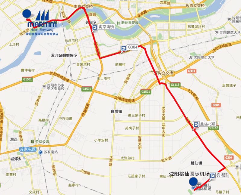 图1 沈阳桃仙机场到玛丽蒂姆酒店的交通路线