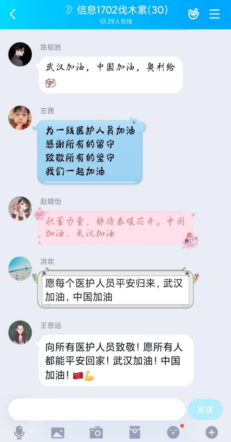 2月9日20:00,信息1702团支部于QQ群开展“众志成城战疫情·共克时艰做先锋“主题团日活动,本次团日活动采用以线上和线下结合的方式开展,团支部全体成员参加,班导师贾建锋、辅导员王鹤棋参与本次团日活动。