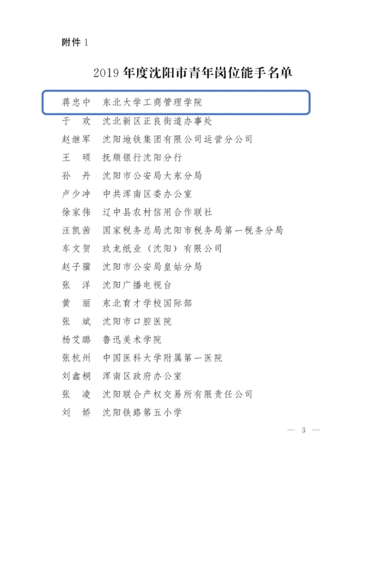近日,由共青团沈阳市委员会、沈阳市人力资源和社会保障局联合开展的2019年度“沈阳市青年岗位能手”评选揭晓,新葡的京官网院长蒋忠中教授被授予“沈阳市青年岗位能手”荣誉称号,是本年度新葡的京集团35222vip唯一获此殊荣的教师代表。