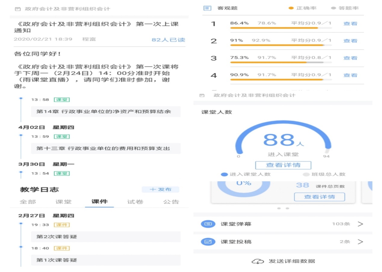 会计学专业全体教师在疫情面前迎难而上,克服重重困难,快速学习雨课堂、腾讯会议、钉钉直播等专业直播平台,有力保障了线上教学的顺利开展。先后对会计学专业本科生开设了《基础会计》、《审计学》、《财务管理》、《税法》、《电算化会计》等多门专业必修课,以及《政府会计及非营利组织会计》、《衍生金融会计》、《成本管理专题》等多门专业选修课。授课教师不仅全面高效开展了线上教学活动,而且保障了良好的教学效果。