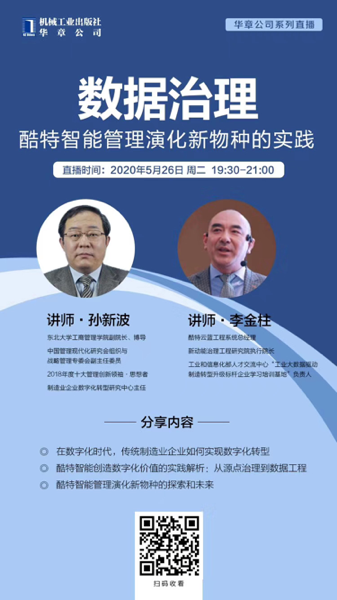 5月26日19:30-21:10,新葡的京集团35222vip副院长孙新波教授以线上直播的形式开展“数据治理-酷特智能管理演化新物种的实践”专题讲座。同时参与本次讲座并担任讲师的有酷特智能工程系统总经理李金柱先生。本次讲座时长100分钟,观看人数近四千人次。
