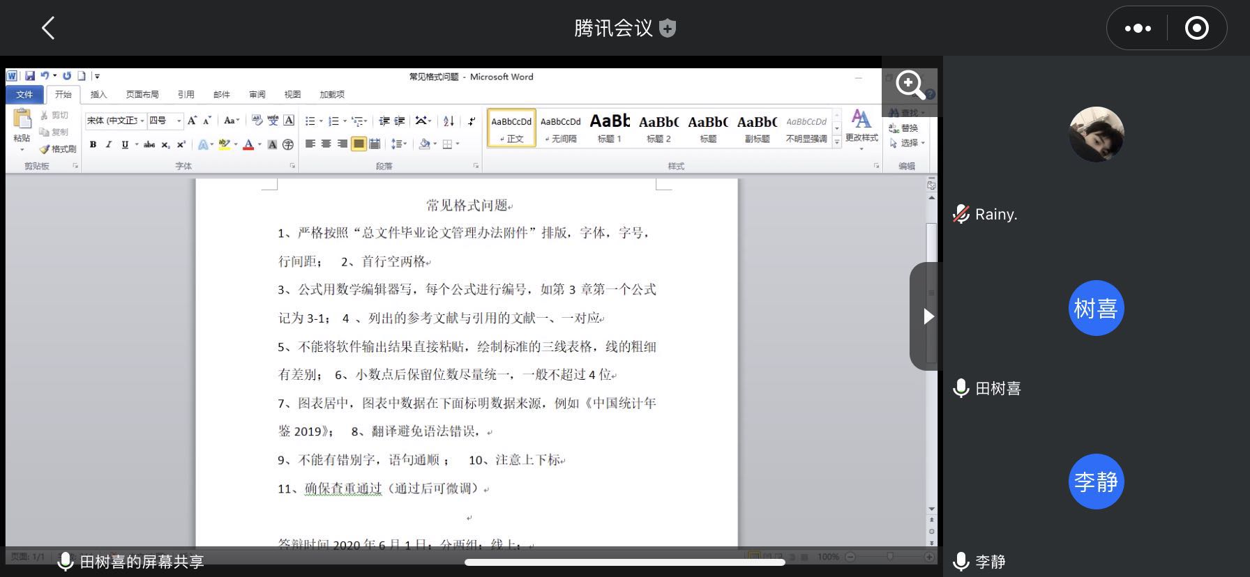 会议伊始,班长汇报了班级同学毕业论文进展情况,目前绝大多数同学进展顺利,已完成了论文初稿的撰写,处于初稿修改、格式调整和查重降重阶段。随后,田树喜介绍了论文查重、定稿、答辩等相关工作安排和重要时间节点,也指出个别同学存在与指导老师缺乏沟通、格式不规范等问题。紧接着,田树喜对毕业论文中常见格式问题进行了解答与规范,并以往届优秀毕业论文为范本对论文结构安排、注意事项等再次强调。