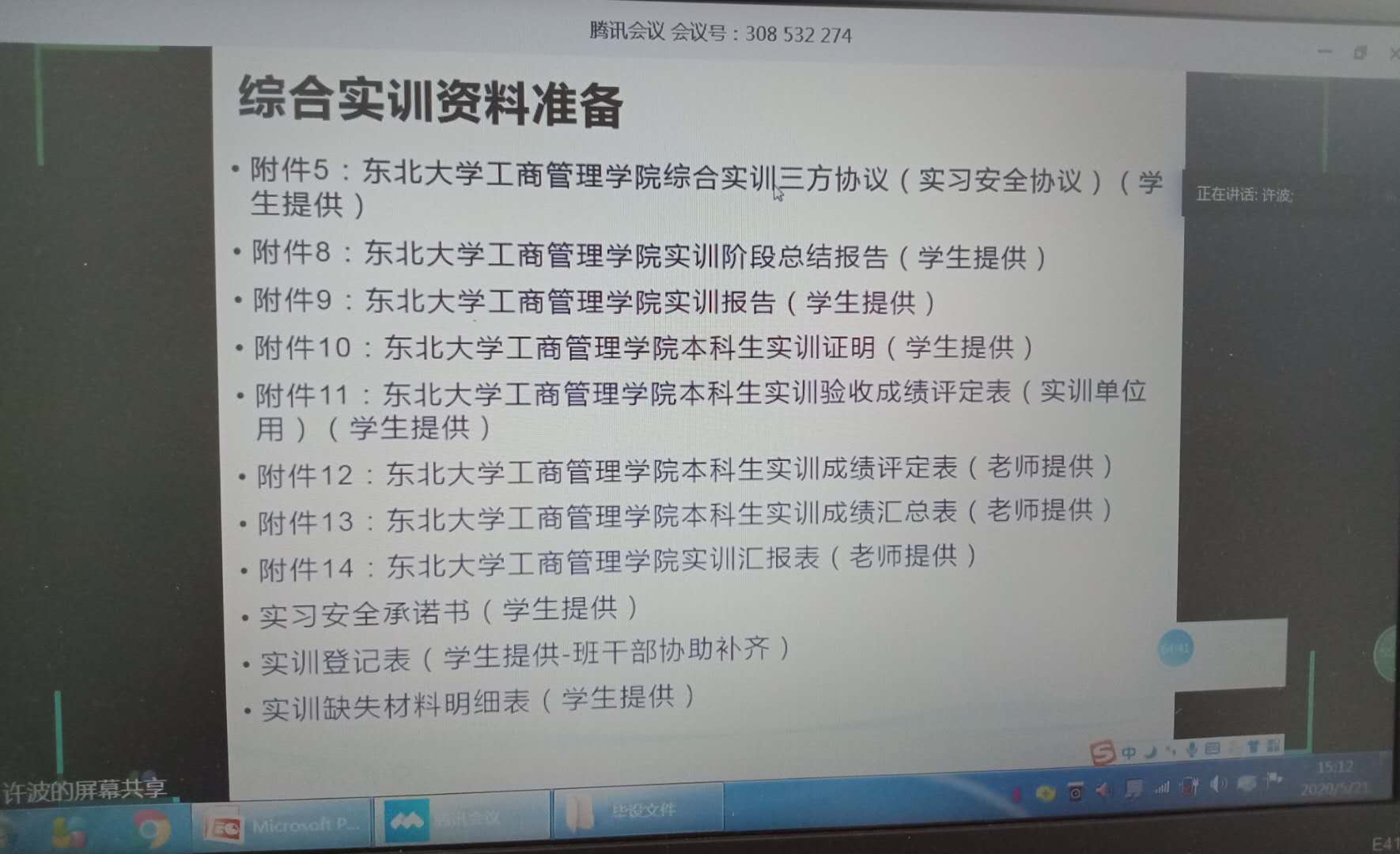 最后,许波老师就综合实训事项与同学们进行了沟通与交流。许波老师首先对学生需要准备和提交的逐项综合实训资料进行了详细的介绍与说明,强调学生需严格按照要求和说明填写和提供综合实训的相关支撑资料;然后详细地介绍和说明了综合实训报销需要准备和提交的材料,建议学生以班级为单位准备和提交报销材料,遇到问题时及时与指导老师和本科课程项目主任沟通;最后对学生提出的相关问题进行了详细地解答。