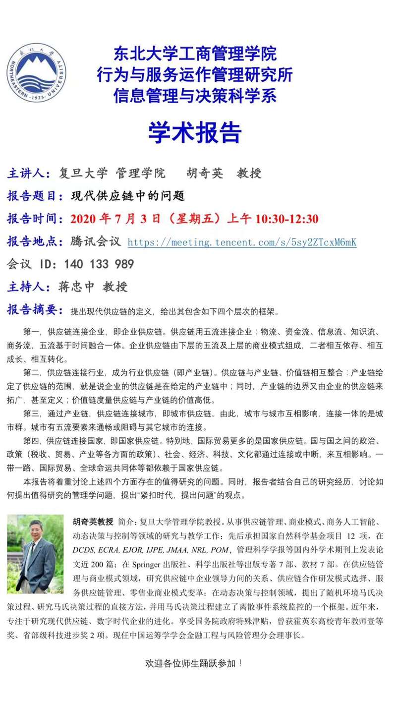邀请复旦大学管理学院胡奇英教授学术报告