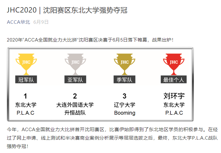 6月5日,ACCA全国就业力大比拼沈阳赛区决赛落下帷幕,经过激烈角逐,由新葡的京集团35222vip会计学专业ACCA方向班本科生刘环宇、张航、王子璇、李家晟组成的P.L.A.C.战队强势夺冠。17级ACCA方向班学生刘环宇荣获沈阳赛区最佳个人表现奖。