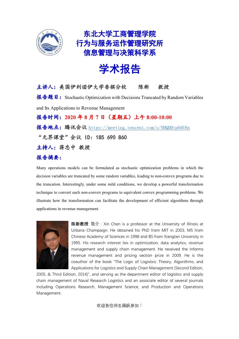 邀请美国伊利诺伊大学香槟分校陈新教授学术报告
