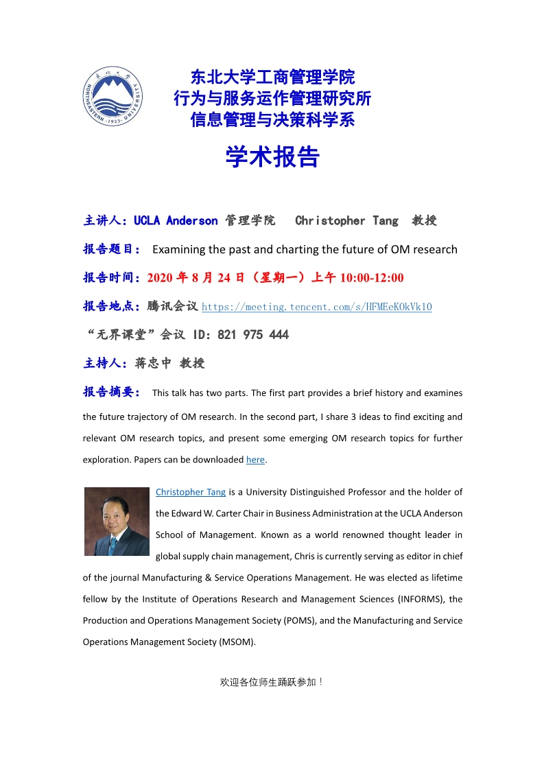 邀请美国加州大学洛杉矶分校Anderson管理学院Christopher Tang教授学术报告