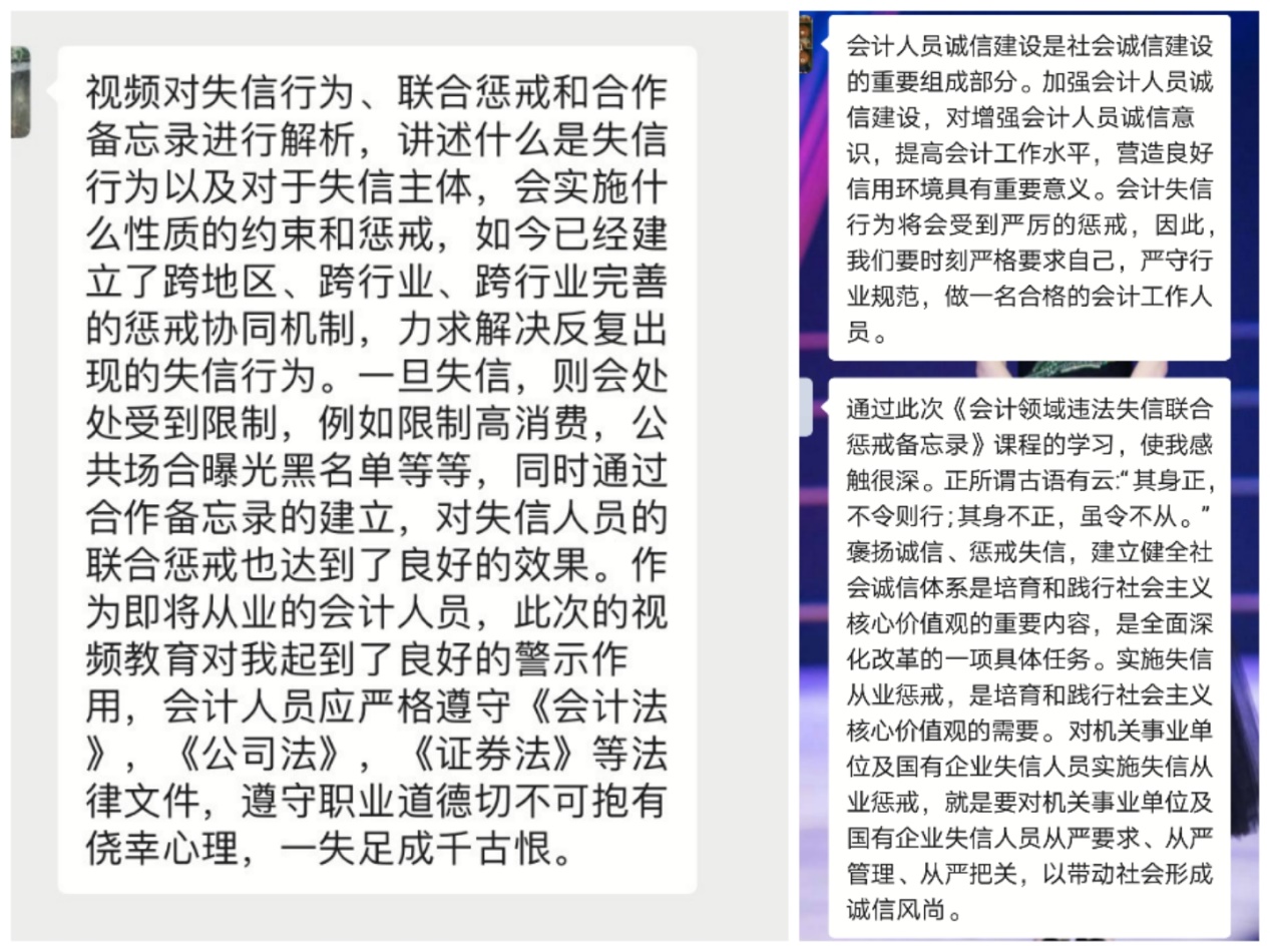 此次活动是党支部在同学们面临择业就业的紧要关头,充分结合自身专业特色,加强职业道德教育的重要一课,与会人员纷纷表示受益匪浅。会后,针对课程中引发的“联合惩戒政策是紧箍咒还是防弹衣”和“会计人员应该如何应对”两个问题,同学们在微信群中展开了热烈讨论,从弘扬社会主义核心价值观、建立健全守信激励和失信惩戒机制、提高会计人员自我修养等多个方面发表了自己的看法,并明确了在今后的学习、工作和生活中,一定要恪守职业底线,加强自我约束,时刻保持清醒头脑,做到爱岗敬业、诚实守信、廉洁自律的共识。