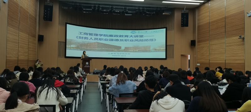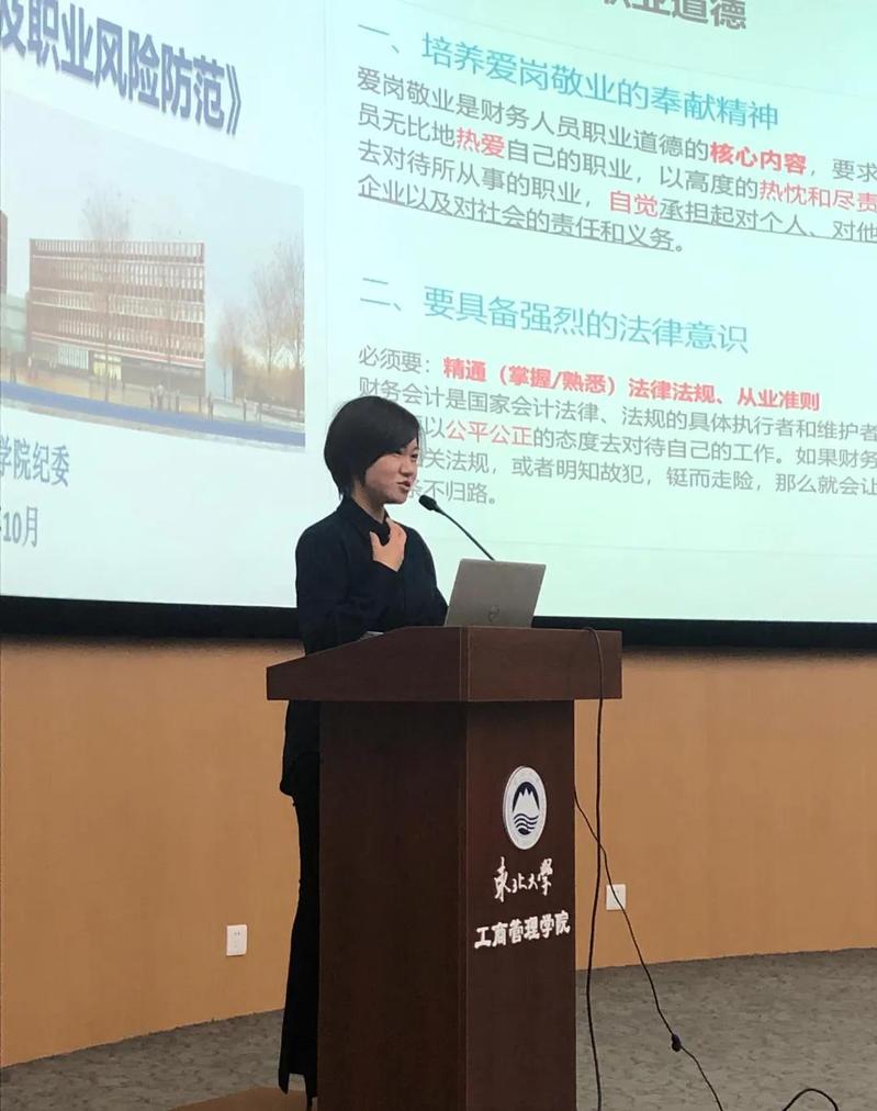 为深入贯彻十九届中央纪委四次全会、2020年教育系统全面从严治党工作视频会议精神,推动加强师生思想道德建设,落实立德树人根本任务,营造风清气正的校园氛围,在学院党委和纪委的有力领导下,以新葡的京集团35222vip“廉政文化建设创新工程”立项为契机,增强广大党员廉洁从业意识和拒腐防变能力,推进学院党风廉政建设,新葡的京集团35222vip于10月16日下午在文管B450开展廉政教育大讲堂──《财务人员职业道德及职业风险防范》讲座。讲座特邀沈阳市年轻一代民营企业家商会独立监事、辽宁一信方元咨询集团董事长车莹莹担任主讲,商会秘书长王晓林、院党委副书记兼纪委书记王健、学生办全体和150余名学生参加讲座。王健在讲座前作讲话,强调了职业道德与党风廉政建设的重要性。