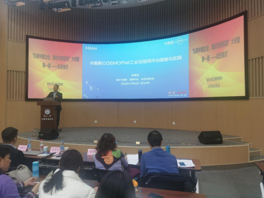 杜崇飞就“海尔人人创客的组织转型与探索”作了主题讲座,生动地讲解了海尔人人创客的组织模式及人单合一非线性管理模式的时代背景及转型逻辑。随后李德金作“卡奥斯COSMOPlat工业互联网平台探索与实践”的主题讲座,系统讲解了COSMOPlat及其运行逻辑及各环节并联协同,使听众对COSMOPlat有直观的认识,引导听众对其经营理念进行深入思考,了解转型基本方向和路径。