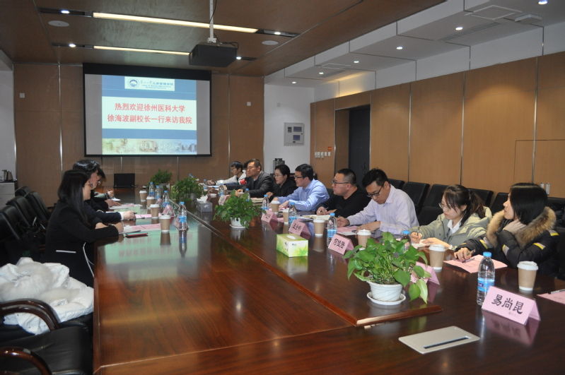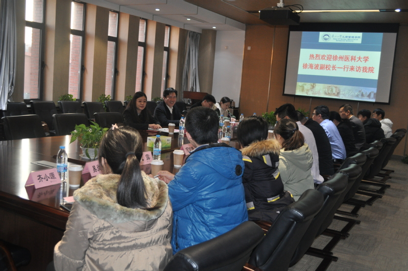 1210日下午,徐州医科大学副校长徐海波、马克思主义学院党总支书记兼院长时统君管理学院副院长覃朝晖(主持工作)人事处人才办副科级秘书王茜一行至新葡的京官网交流访问,院长蒋忠中、副院长赵红梅、严立宁、院办主任王寰、党委组织员王全彬及博士生代表共同接待。