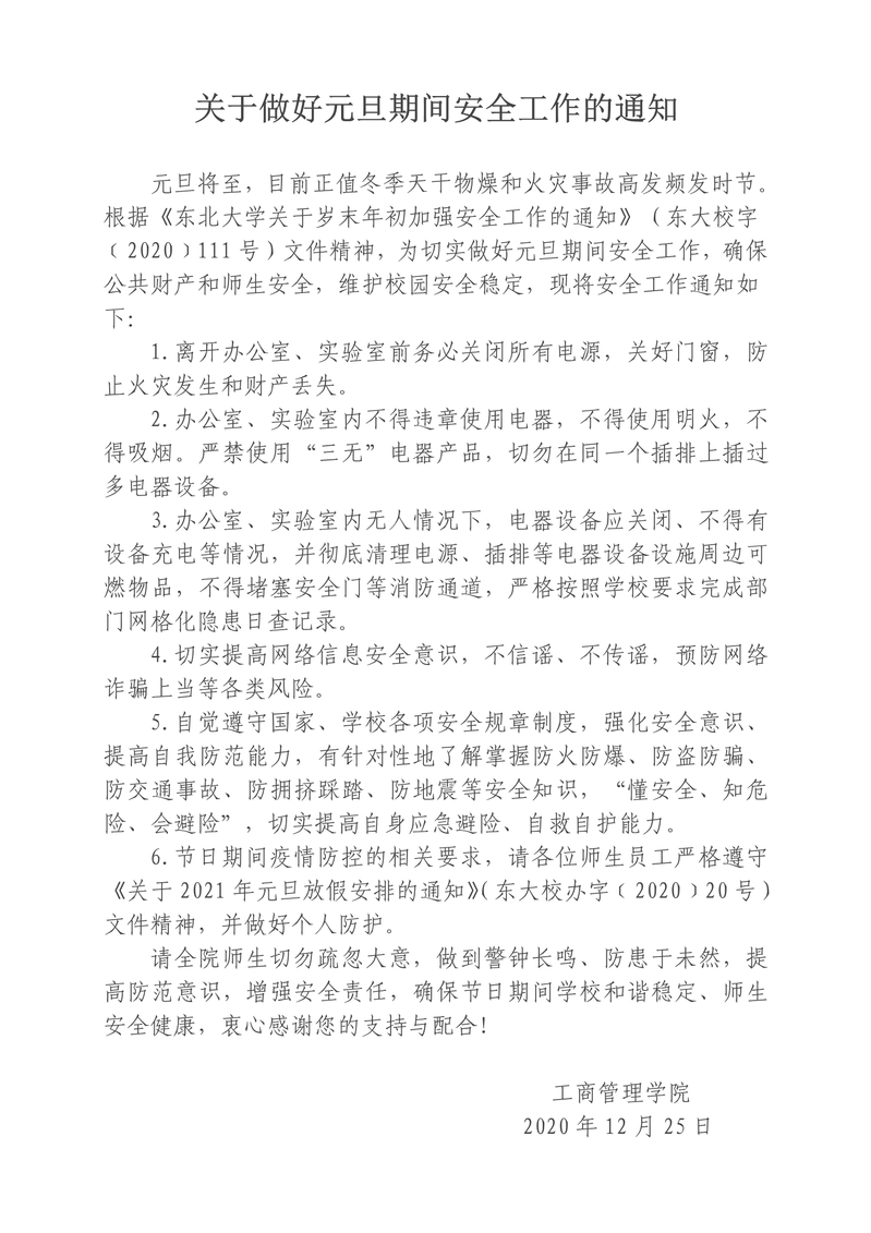 关于做好元旦期间安全工作的通知