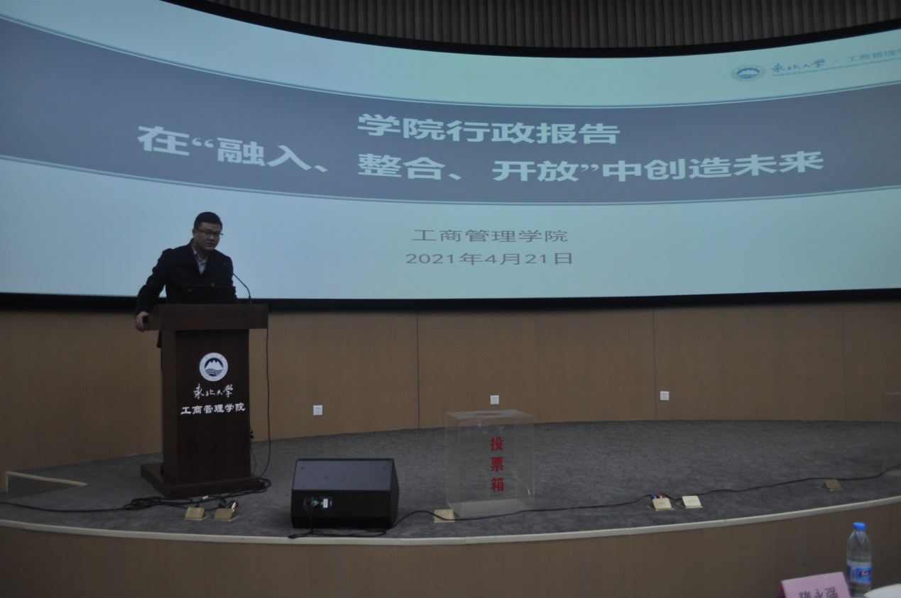 会议在庄严的国歌声中拉开序幕,学院院长蒋忠中首先代表学院作了学院行政及财务工作报告,报告客观详实地回顾过去一年学院在综合改革、人才培养、学科专业建设、师资队伍、科研能力、学术交流、党政建设等方面取得的成绩。并对未来学院工作进行了展望,提出了清晰的目标和路径。
