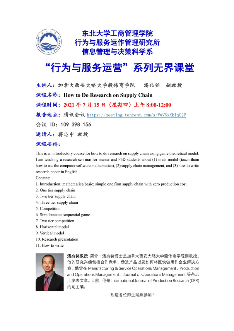 邀请加拿大西安大略大学毅伟商学院潘兆铭副教授学术报告