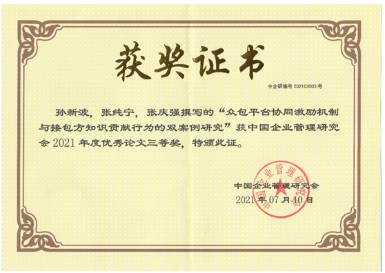 2021年7月10日,“新发展阶段的中国企业管理创新与发展”暨中国企业管理研究会2021年会顺利召开。中国企业管理研究会会长、中国社会科学院工业经济研究所黄速建研究员,中国社会科学院工业经济研究所陈于武副所长,中国社会科学院工业经济研究所沈志渔研究员,中国人民大学徐二明教授,南开大学李维安教授和白长虹教授,北京师范大学戚聿东教授,《南开管理评论》、《经济研究》、《经济学动态》、《中国工业经济》、《经济管理》和《山东大学学报(哲学社会科学版)》各知名期刊主编、副主编、编辑部主任等出席会议。新葡的京官网孙新波教授团队论文《众包平台协同激励机制与接包方知识贡献行为的双案例研究》获中国企业管理研究会2021年度优秀论文奖,黄速建研究员、沈志渔研究员和朱有志教授为获奖论文颁奖。