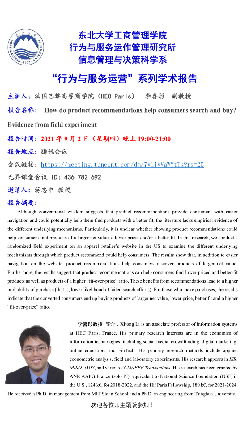 邀请法国巴黎高等商学院(HEC Paris)李喜彤副教授学术报告