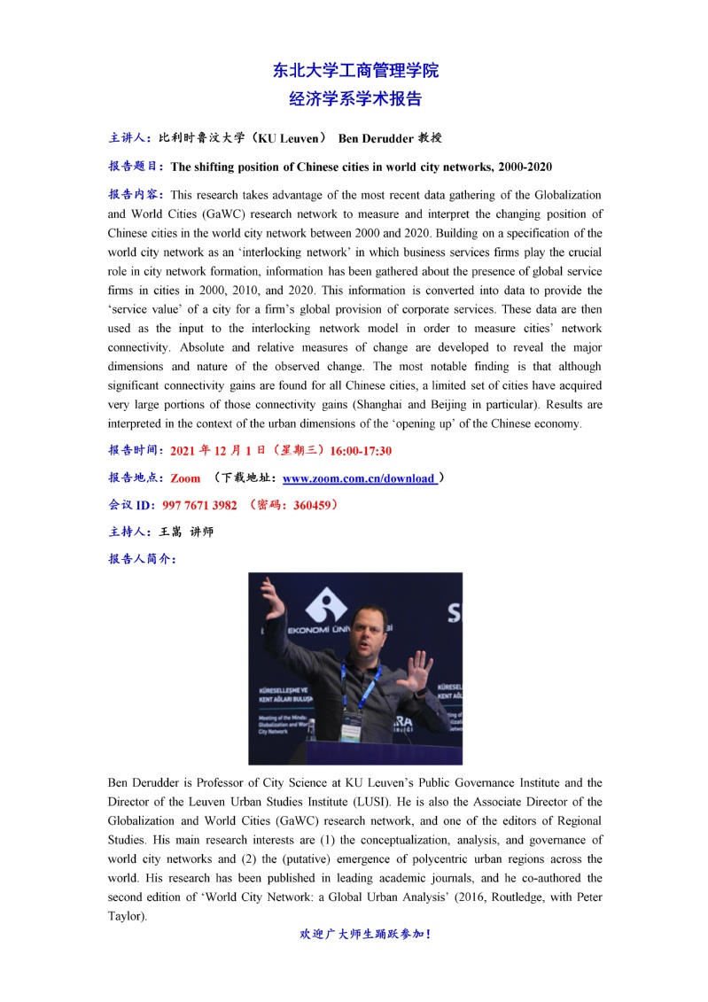 邀请比利时鲁汶大学(KU Leuven)Ben Derudder教授学术报告