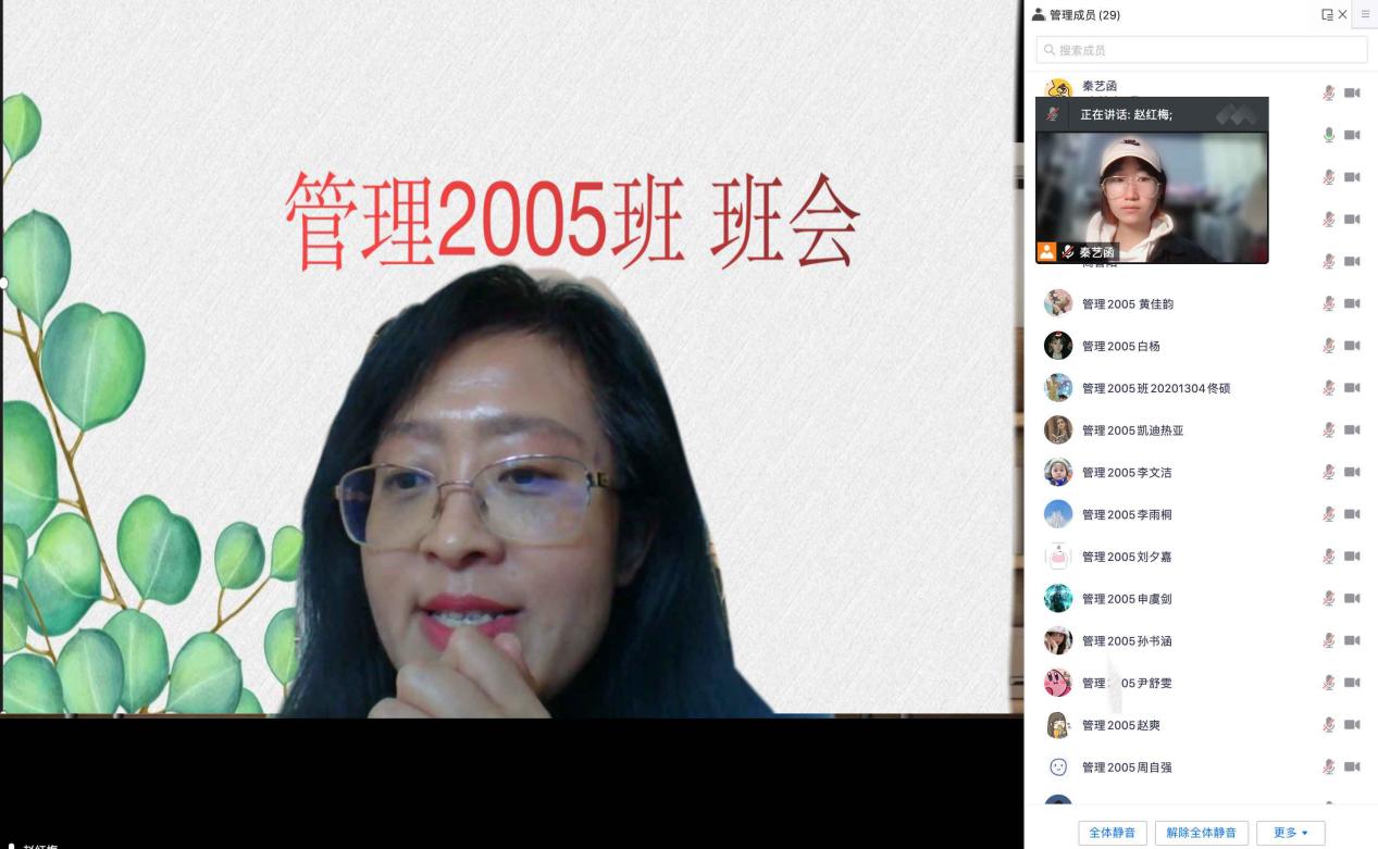 32411:00,管理2005班于线上开展了新学期线上交流会,副院长赵红梅应邀出席,管理2005班全体同学参与了本次会议。