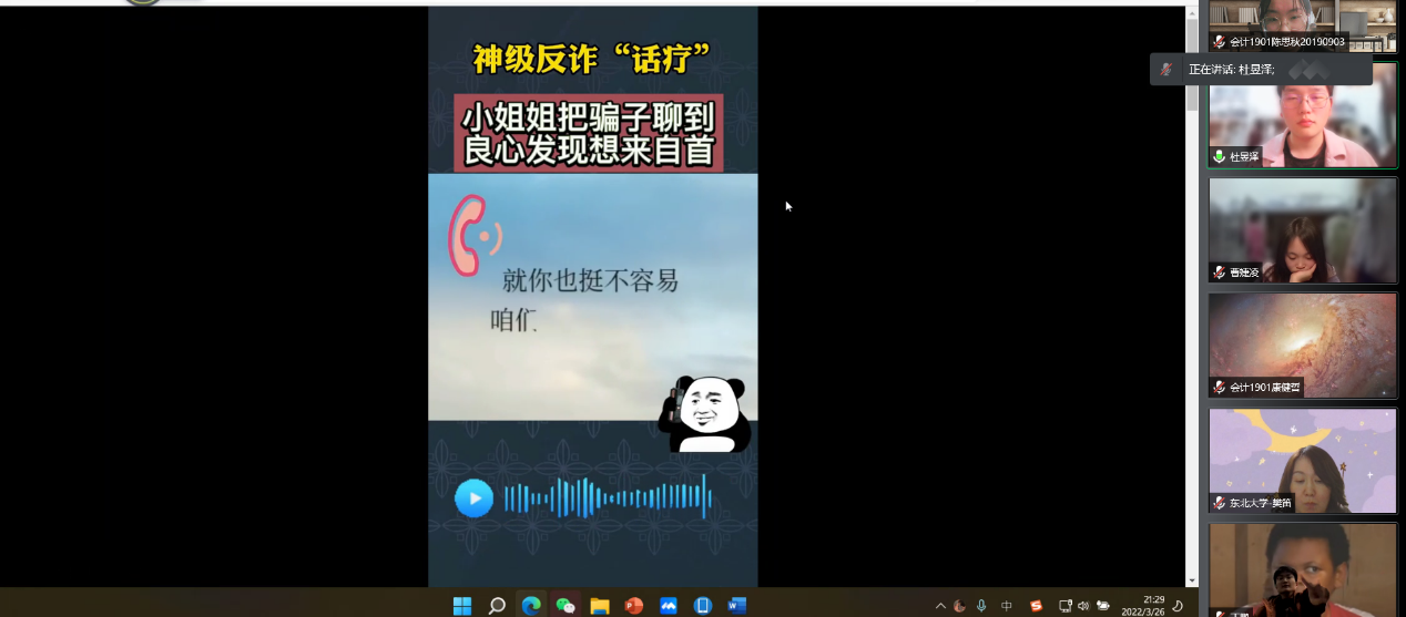 2022326日,会计1901团支部线上开展了“奥运精神催奋进·学习雷锋启新程”主题团日活动。国际教育学院副院长樊笛、班导师黄训江、辅导员芦书豪应邀出席。