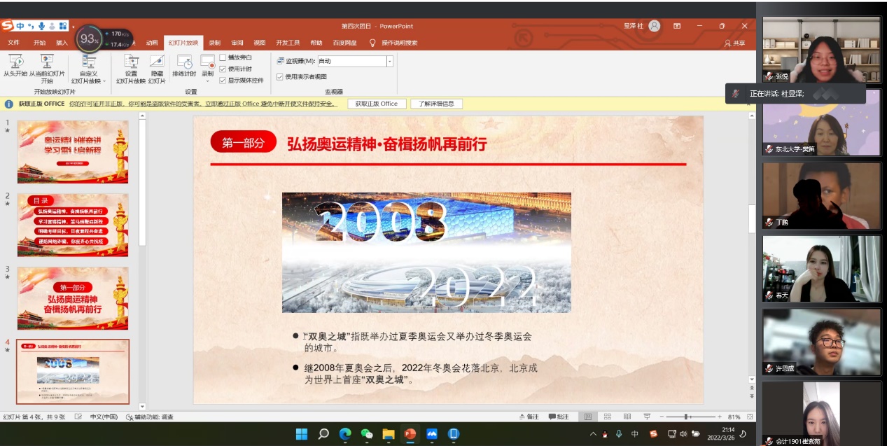 在团日的第一部分活动中,支部成员通过腾讯会议共同观看以“双奥之城”为主题的视频讲解,深入了解“双奥之城”的意义所在,深刻感受北京作为第一个双奥之城所蕴含的中国力量,增强民族荣誉感与自豪感。随后,支部在班级群进行了线上知识竞赛,组织了“我爱双奥”主题书法大赛。