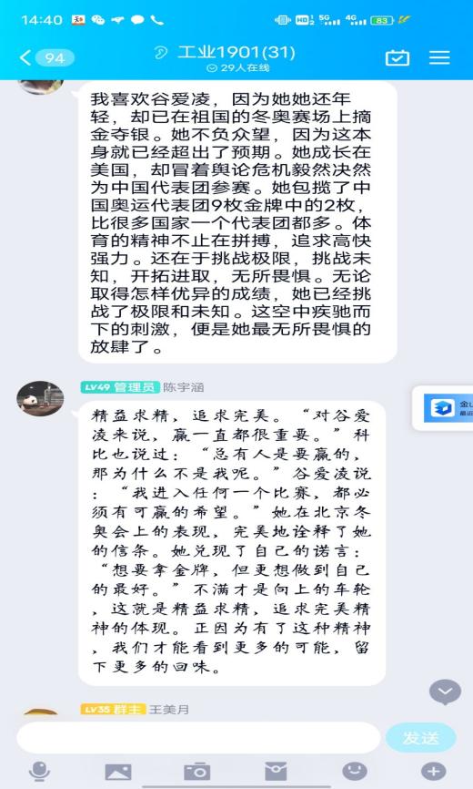 团日活动中,团支部全体成员共同学习习近平总书记给中国冰雪健儿的回信精神和北京冬奥会、中国女足亚洲杯等体育盛会、赛事中冬奥健儿和女足队员的爱国情操和拼搏精神。团支部成员结合自身奥运观赛经历,分享各自喜欢的运动员的事迹和精神,彼此激发青年的爱国情怀,培养坚韧不拔的意志品质,凝聚和焕发青春力量。