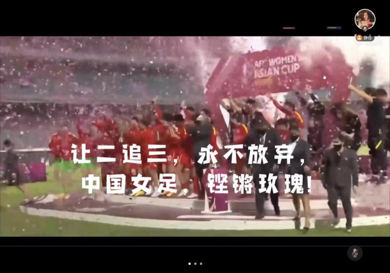 弘扬奥运精神,奋进扬帆再前行。团日伊始,团支部回看了中国女足亚洲杯夺冠精彩瞬间。实力和精神,造就了铿锵玫瑰,促成了中国女足的此次胜利。她们取得成就时不浮躁,遭遇低谷时不放弃。对自我严格要求、拼搏不息的精神,正是体育竞技场和漫漫人生路上共同需要的精神。随后,团支部同学踊跃发言,分享自己眼中的奥运精神,希望大家争做时代的奋斗者、拼搏者,永远保持青年一代的朝气和活力。