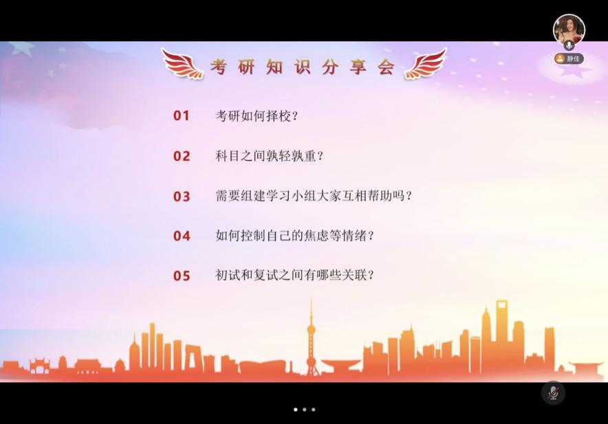 为了解答同学们在学业、考研等方面的困惑,本次团日特邀金融1901班班导师李伟伟来为同学们解答存在的问题。考研对2019级的学生而言,可能还有一段距离,但是提前思考、规划未来、充分准备,总会在面临选择时,更加从容淡定。李伟伟老师介绍了当前考研的形势以及该做的准备,同学们积极与老师们进行互动。19级的同学们正处于考研复习的关键阶段,通过班导师见面会,定期帮助学生解决上网课过程中或生活中遇到的问题、困难,调整心态至关重要。同学们也纷纷表示此次会议受益良多。(金融1901团支部 供稿)
