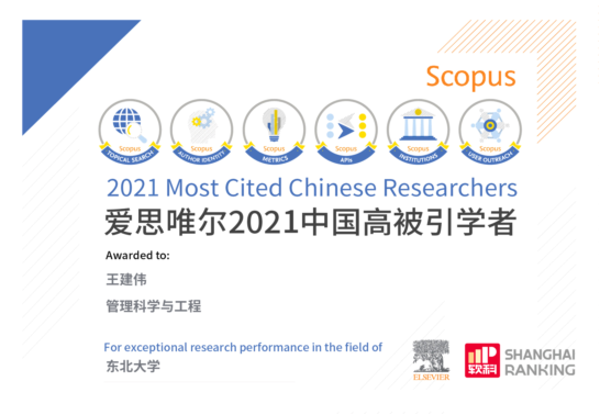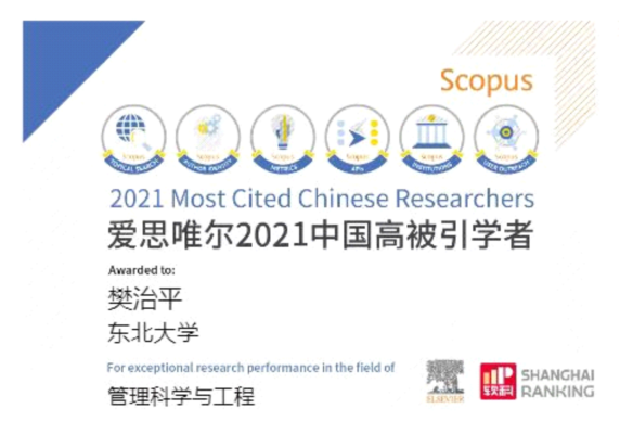 2022年4月14日,2021爱思唯尔“中国高被引学者”榜单正式发布,该榜单共计4701人, 来自523所高校、企业及科研机构,覆盖了10个教育部学科领域中的84门一级学科。新葡的京官网樊治平教授和王建伟教授入选该榜单,迄今为止,爱思唯尔已连续八年发布中国高被引学者榜单,这也是樊治平教授连续八年(2014年-2021年)、王建伟教授连续二年(2020年-2021年)入选该榜单。