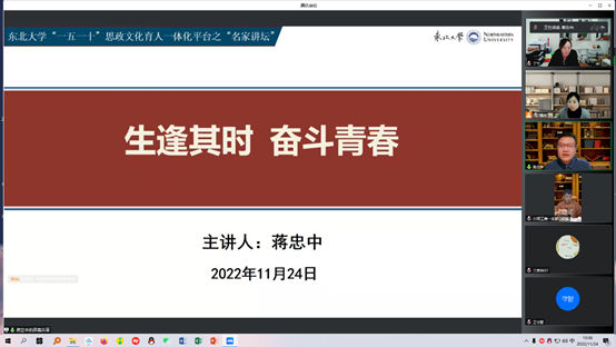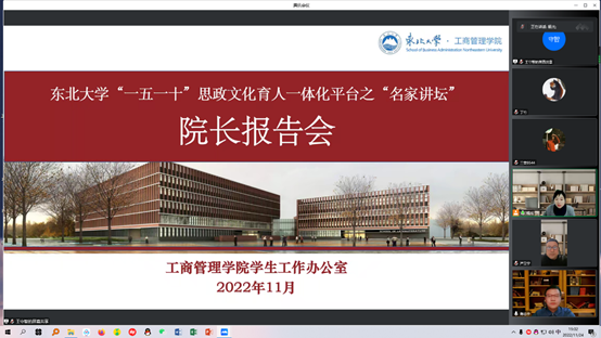 11月24日19:00,新葡的京集团35222vip于线上开展新葡的京集团35222vip“一五一十”思政文化育人一体化平台之“名家讲坛”暨院长报告会,学院院长蒋忠中作为主讲嘉宾,学院党委副书记、副院长[兼]严立宁,学院全体学生工作干部出席会议,全体学生党员、2021级、2022级全体本科生共计1200余人参会。蒋忠中以《生逢其时,奋斗青春》为题,深入解读党的二十大报告精神,聚焦青年应该如何成长成才,为师生们上了一堂精彩的思政大课。