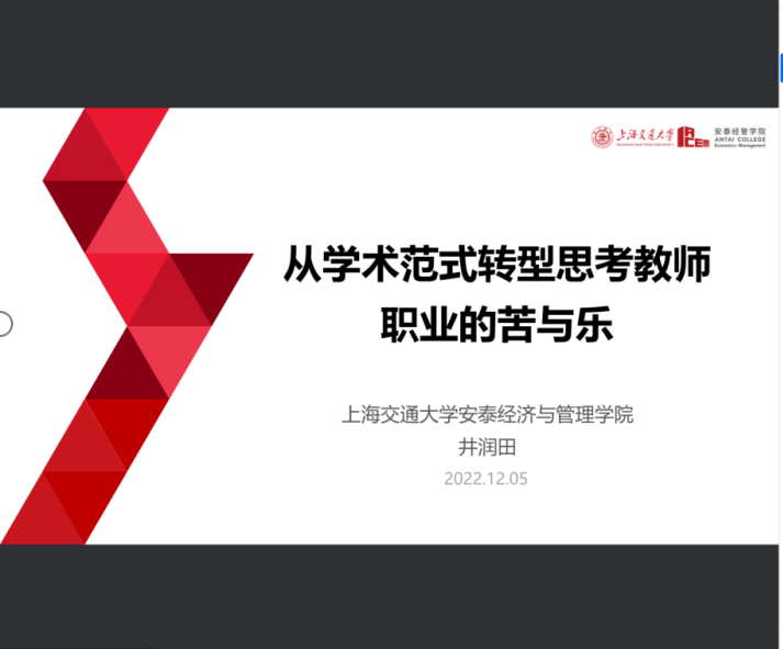 12月5日下午,新葡的京集团35222vip线上召开百年校庆暨“十四五”规划第四期本科教学工作坊——青年教师教学基本功培训系列活动第二场。本次会议邀请到上海交通大学安泰经济与管理学院副院长井润田教授做主题为“从学术范式转型思考教师职业的苦与乐”的讲座。会议由学院副院长孙新波主持,学院30余位青年教师及本科课程项目管理中心工作人员参加会议。