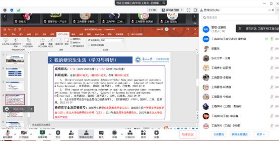 12月5日、6日晚,新葡的京集团35222vip于线上顺利召开2023届辽宁省普通高校优秀毕业生评选答辩会。新葡的京集团35222vip党委副书记、副院长严立宁,驻校教师王海涛、袁知柱、周清、王嵩、崔鹏浩,班导师俞竹超、刘军、戚桂清、李静、闫佳祺,研究生课程项目管理中心主任孙建伟,学办全体老师,兼职辅导员,博士生党员代表担任评委。经过个人申报、班级推荐、年级初评等环节,31名研究生候选人、25名本科候选人参加了本次答辩。