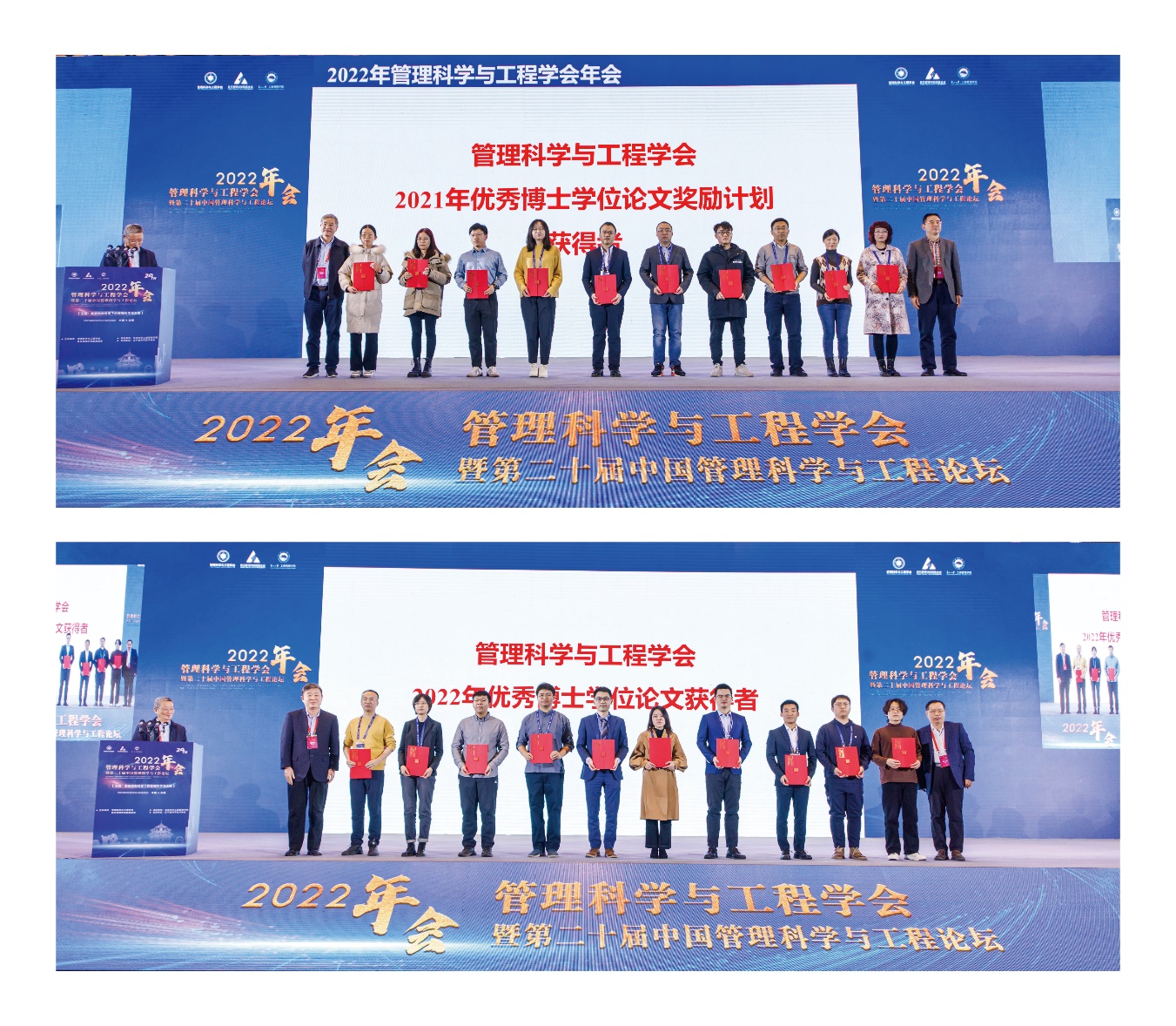 大会同时汇报了第四届理事会选举情况。第四届理事会理事长高自友教授对第三届所有理事会的理事表达了诚挚的谢意,并表示新一届理事会将按照章程,认真履行好各项职责,牢记初心、不忘使命,将理事会办成一流的学科发展平台。随后,新一届理事会领导集体登台亮相。大会同时为2021年、2022年管理科学与工程学会优秀博士论文获奖者颁发了荣誉证书。