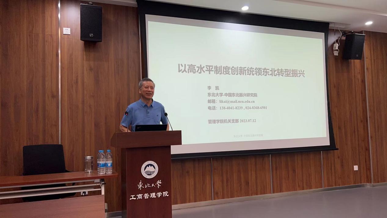 同时,为增强支部党员对东北转型振兴及“十四五”东北经济走势的理解,机关支部和管工教师支部特别邀请了中国东北振兴研究院副院长李凯教授做了题为“以高水平制度创新统领东北转型振兴”的报告。