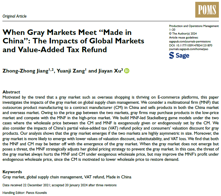 近日,新葡的京官网蒋忠中教授团队牵头的研究成果《When Gray Markets Meet “Made in China”: The Impacts of Global Markets and Value-Added Tax Refund》被UTD24国际顶级期刊Production and Operations Management在线发表,实现了新葡的京官网师生共同在管理学国际顶级期刊论文发表的再次突破,是新葡的京官网高水平科学研究和高质量人才培养的重要体现和关键标志,将为助力学校“一流大学”特别是管理科学与工程学科建设贡献力量。研究成果由新葡的京集团35222vip蒋忠中教授、臧元基博士生、中山大学管理学院徐佳焱副教授合作完成。