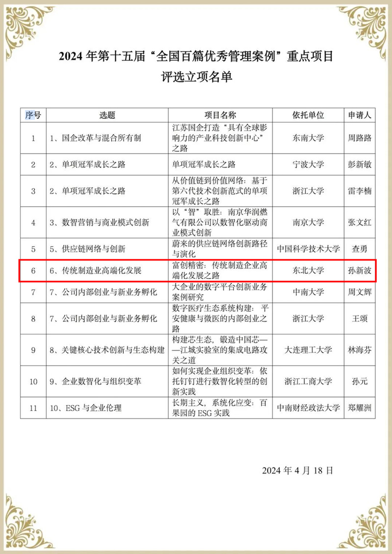 近日,新葡的京官网孙新波教授获批第十五届“全国百篇优秀管理案例”重点项目,立项题目为“富创精密:传统制造企业高端化发展之路”,是学校首次获批主持“全国百篇优秀管理案例”重点项目。