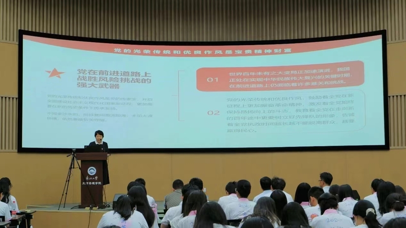 党课伊始,在场全体人员齐唱国歌。任丽围绕“持之以恒发扬党的光荣传统和优良作风”的主题为同学们讲授了毕业前最后一堂党课。课堂上,任丽强调,党的光荣传统和优良作风,是党的生命力源泉,是党的成功密码,身为青年党员,应当坚定培养对党忠诚的政治品质,切实践行理论联系实际的优良学风,牢记全心全意为人民服务的根本宗旨。这堂党课不仅对同学们过去几年学习生活进行了总结,更为同学们的未来人生道路指明了前进的方向。