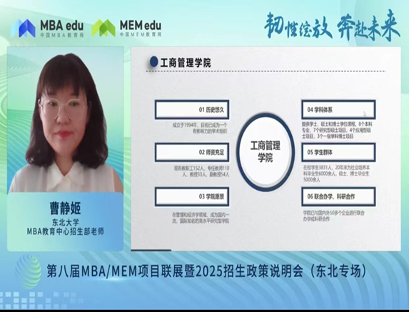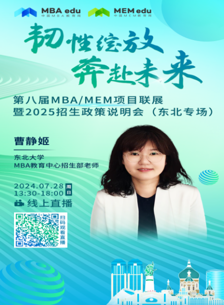 2024年7月28日,由中国MBA教育网主办的第八届MBA/MEM项目联展暨2025年招生政策发布会(东北专场)以线上形式成功举行,共同探索东北地区MBA/MEM项目的优质资源和最新招生动态。新葡的京集团35222vip作为东北地区MBA教育项目知名培养院校之一参与了本次招生政策发布会。线上参与考生人数达2000余人。