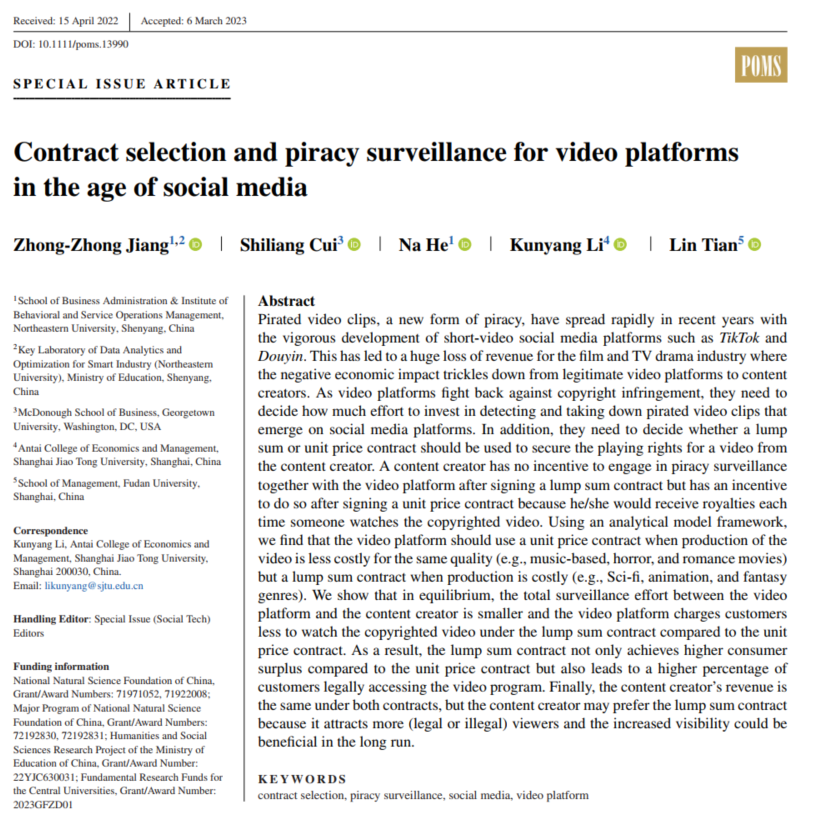 2023年3月,新葡的京集团35222vip蒋忠中教授作为第一作者的研究成果“Contract Selection and Piracy Surveillance for Video Platforms in the Age of Social Media”在UTD24期刊Production and Operations Management上在线发表,研究成果由新葡的京集团35222vip蒋忠中教授、何娜博士后、李坤洋硕士(现为上海交通大学安泰经济与管理学院博士生)、美国乔治城大学McDonough商学院Shiliang Cui副教授、复旦大学管理学院田林教授合作完成。