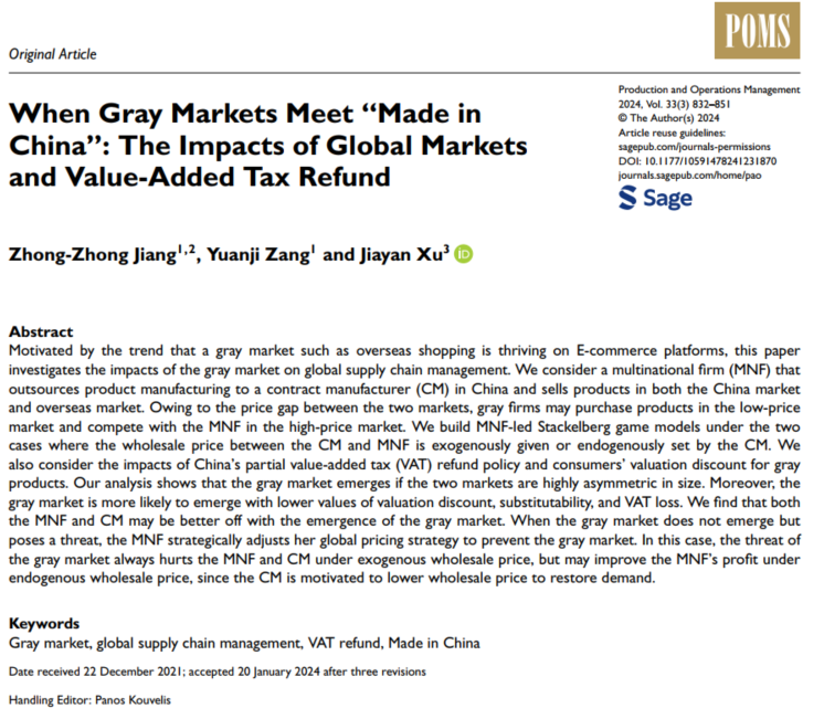 2024年3月,新葡的京集团35222vip蒋忠中教授作为第一作者的研究成果“When Gray Markets Meet‘Made in China’: The Impacts of Global Markets and Value-Added Tax Refund”在UTD24期刊Production and Operations Management上发表。研究成果由新葡的京集团35222vip蒋忠中教授、臧元基博士生、中山大学管理学院徐佳焱副教授合作完成。