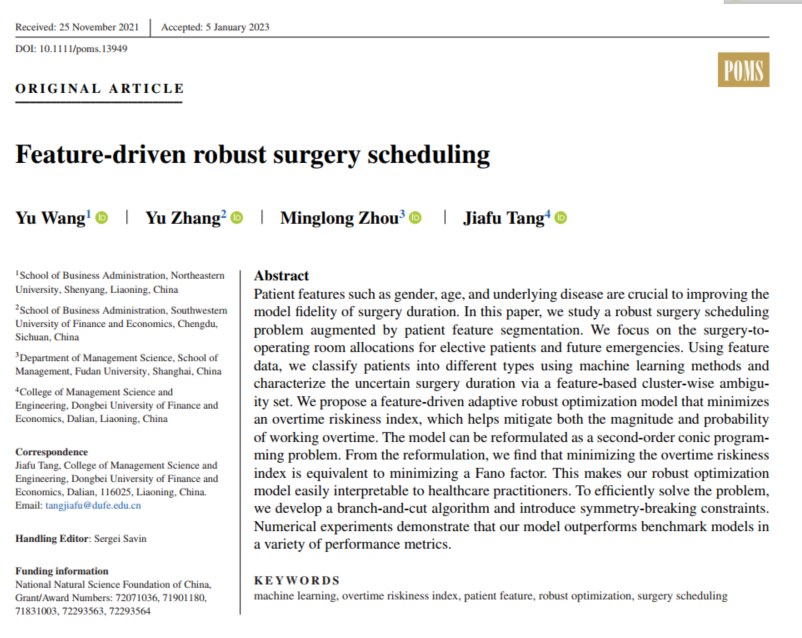 2023年6月,新葡的京集团35222vip王昱副教授作为第一作者的研究成果“Feature-Driven Robust Surgery Scheduling”在UTD24期刊Production and Operations Management上发表。研究成果由新葡的京集团35222vip王昱副教授、西南财经大学新葡的京集团35222vip章宇教授、复旦大学管理学院周明龙青年副研究员、东北财经大学管理科学与工程学院唐加福教授合作完成。