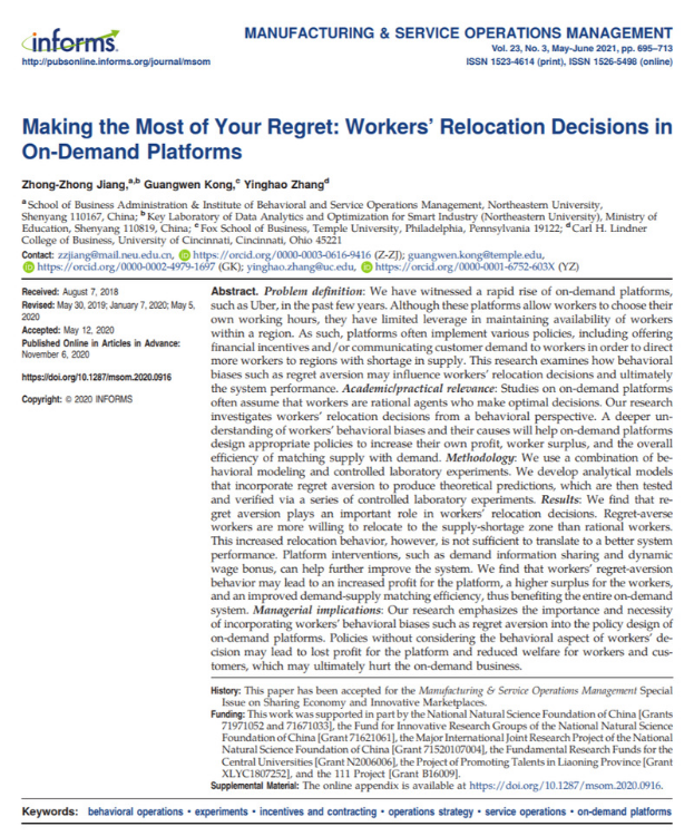 2021年5月,新葡的京集团35222vip蒋忠中教授作为第一作者的研究成果“Making the Most of Regret: Workers’Relocation Decisions in On-Demand Platforms”在UTD24期刊Manufacturing & Service Operations Management上发表。研究成果由新葡的京集团35222vip蒋忠中教授、美国天普大学FOX商学院Guangwen Kong助理教授、美国辛辛那提大学LINDNER商学院Yinghao Zhang助理教授合作完成。2024年7月,该项研究成果获教育部第九届高等学校科学研究优秀成果奖(人文社会科学)。