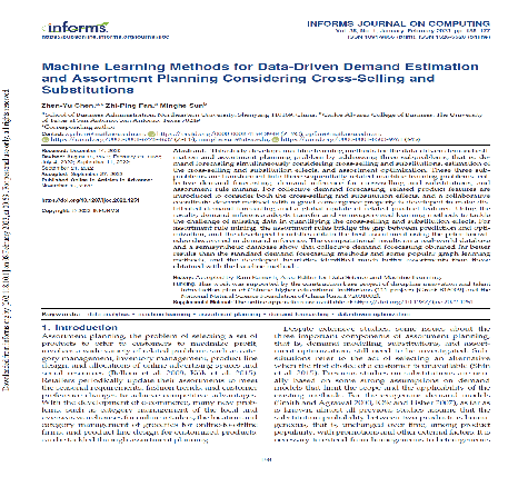 2023年1月,新葡的京集团35222vip陈震宇研究员作为第一作者的研究成果“Machine Learning Methods for Data-Driven Demand Estimation and Assortment Planning Considering Cross-Selling and Substitutions”在UTD24期刊INFORMS Journal on Computing上发表。研究成果由新葡的京集团35222vip陈震宇研究员、樊治平教授、美国德州大学圣安东尼奥分校孙明和教授合作完成。